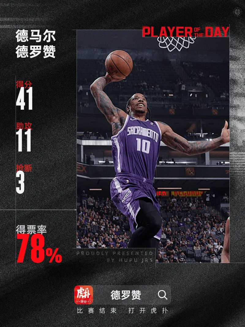 全场比赛,国王球员德马尔-德罗赞首发出战38分钟,21投11中,三分球3投1中,罚球21罚18中得到41分4篮板11助攻3抢断。