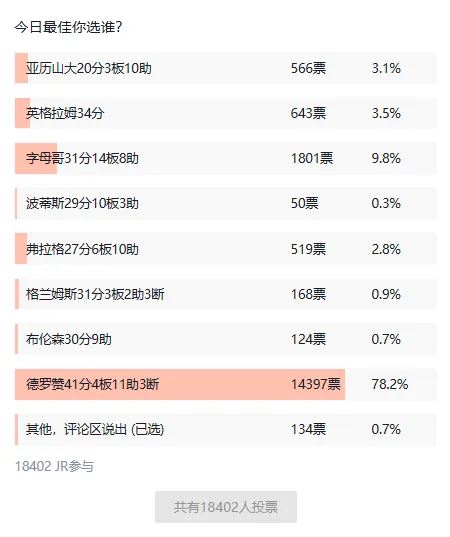 今日JRs评选已经结束,国王球员德马尔-德罗赞以78.2%的得票率、14397票当选今日JRs评选最佳球员(数据截止此帖发布前)。